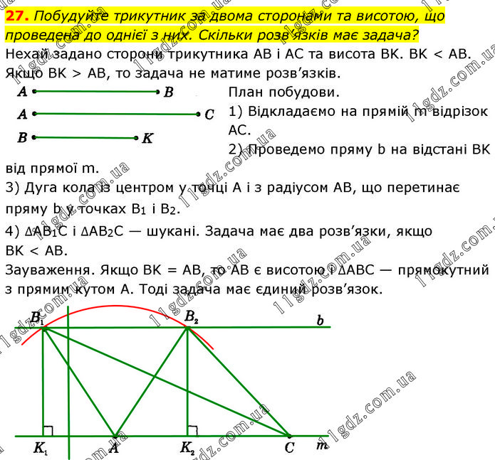 Побудуйте трикутник за двома сторонами та висотою, що проведена до однієї з них. Скільки розв’язків має задача? Нехай задано сторони трикутника AB і AC та висота BK. BK < AB. Якщо BK > AB, то задача не матиме розв’язків. План побудови. 1) Відкладаємо на прямій m відрізок АС. 2) Проведемо пряму b на відстані BK від прямої m. 3) Дуга кола із центром у точці А і з радіусом AB, що перетинає пряму b у точках B1 і B2. 4) ∆AB1C і ∆AB2C — шукані. Задача має два розв’язки, якщо BK < AB. Зауваження. Якщо BK = AB, то AB є висотою і ∆ABC — прямокутний з прямим кутом А. Тоді задача має єдиний розв’язок.