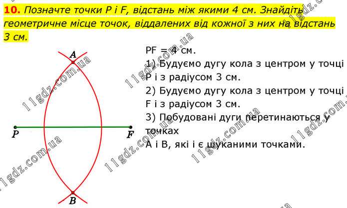 Позначте точки P і F, відстань між якими 4 см. Знайдіть геометричне місце точок, віддалених від кожної з них на відстань 3 см. PF = 4 см. 1) Будуємо дугу кола з центром у точці P і з радіусом 3 см. 2) Будуємо дугу кола з центром у точці F і з радіусом 3 см. 3) Побудовані дуги перетинаються у точках A і B, які і є шуканими точками.