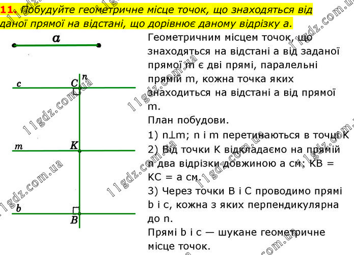 Побудуйте геометричне місце точок, що знаходяться від даної прямої на відстані, що дорівнює даному відрізку а. Геометричним місцем точок, що знаходяться на відстані а від заданої прямої m є дві прямі, паралельні прямій m, кожна точка яких знаходиться на відстані а від прямої m. План побудови. 1) n⊥m; n і m перетинаються в точці K 2) Від точки K відкладаємо на прямій n два відрізки довжиною а см: KB = KC = а см. 3) Через точки B і C проводимо прямі b і с, кожна з яких перпендикулярна до n. Прямі b і с — шукане геометричне місце точок.