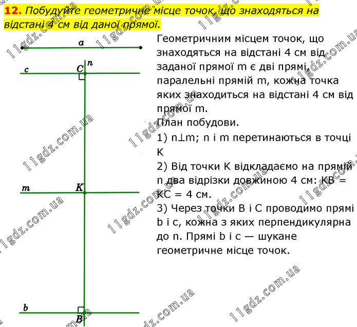 Побудуйте геометричне місце точок, що знаходяться на відстані 4 см від даної прямої. Геометричним місцем точок, що знаходяться на відстані 4 см від заданої прямої m є дві прямі, паралельні прямій m, кожна точка яких знаходиться на відстані 4 см від прямої m. План побудови. 1) n⊥m; n і m перетинаються в точці K 2) Від точки K відкладаємо на прямій n два відрізки довжиною 4 см: KB = KC = 4 см. 3) Через точки B і C проводимо прямі b і с, кожна з яких перпендикулярна до n. Прямі b і с — шукане геометричне місце точок.