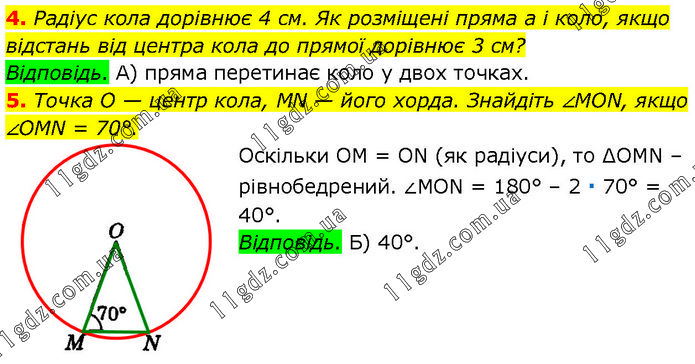 4. Радіус кола дорівнює 4 см. Як розміщені пряма а і коло, якщо відстань від центра кола до прямої дорівнює 3 см? Відповідь. А) пряма перетинає коло у двох точках. 5. Точка O — центр кола, MN — його хорда. Знайдіть ∠MON, якщо ∠OMN = 70°. Оскільки OM = ON (як радіуси), то ∆OMN – рівнобедрений. ∠MON = 180° – 2 ∙ 70° = 40°. Відповідь. Б) 40°.