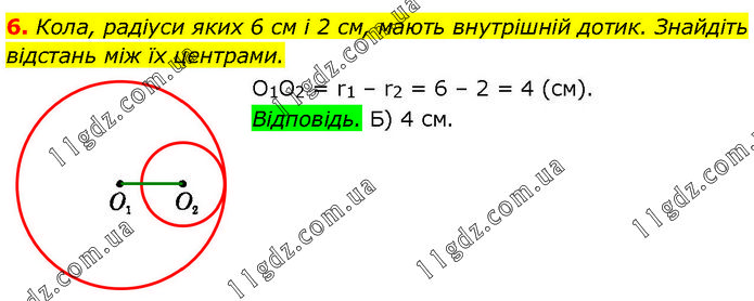 Кола, радіуси яких 6 см і 2 см, мають внутрішній дотик. Знайдіть відстань між їх центрами. O1O2 = r1 – r2 = 6 – 2 = 4 (см). Відповідь. Б) 4 см.