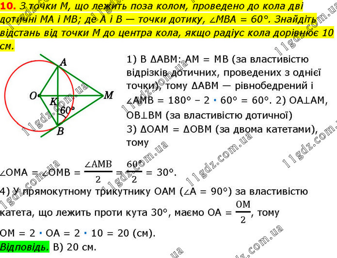 З точки М, що лежить поза колом, проведено до кола дві дотичні MA і MB; де А і В — точки дотику, ∠MBA = 60°. Знайдіть відстань від точки M до центра кола, якщо радіус кола дорівнює 10 см. 1) В ∆АВМ: AM = MB (за властивістю відрізків дотичних, проведених з однієї точки), тому ∆ABM — рівнобедрений і ∠AMB = 180° – 2 ∙ 60° = 60°. 2) OA⊥AM, OB⊥BM (за властивістю дотичної) 3) ∆OAM = ∆OBM (за двома катетами), тому ∠OMA = ∠OMB = (∠АМВ)/2 = (60°)/2 = 30°. 4) У прямокутному трикутнику OAM (∠A = 90°) за властивістю катета, що лежить проти кута 30°, маємо OA = ОМ/2, тому OM = 2 ∙ OA = 2 ∙ 10 = 20 (см). Відповідь. В) 20 см.