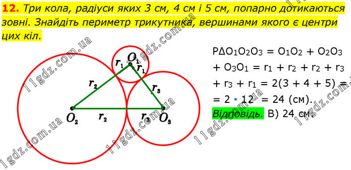 Три кола, радіуси яких 3 см, 4 см і 5 см, попарно дотикаються зовні. Знайдіть периметр трикутника, вершинами якого є центри цих кіл. Р∆О1О2О3 = О1О2 + О2О3 + О3О1 = r1 + r2 + r2 + r3 + r3 + r1 = 2(3 + 4 + 5) = 2 ∙ 12 = 24 (см). Відповідь. В) 24 см.