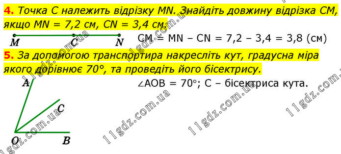 4. Точка C належить відрізку MN. Знайдіть довжину відрізка СМ, якщо MN = 7,2 см, CN = 3,4 см. СМ = MN – CN = 7,2 – 3,4 = 3,8 (см) 5. За допомогою транспортира накресліть кут, градусна міра якого дорівнює 70°, та проведіть його бісектрису. ∠АОВ = 70°; С – бісектриса кута.