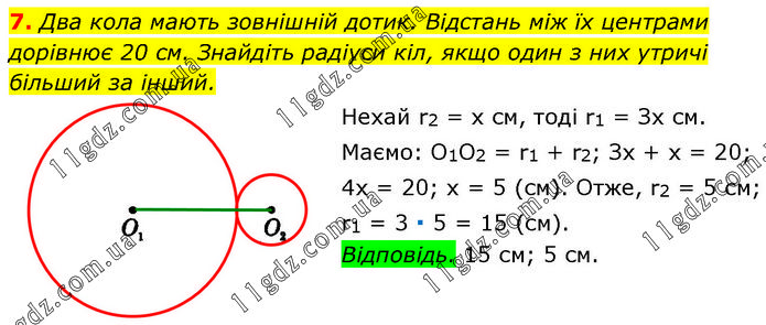 Два кола мають зовнішній дотик. Відстань між їх центрами дорівнює 20 см. Знайдіть радіуси кіл, якщо один з них утричі більший за інший. Нехай r2 = х см, тоді r1 = Зх см. Маємо: O1O2 = r1 + r2; Зх + х = 20; 4х = 20; х = 5 (см). Отже, r2 = 5 см; r1 = 3 ∙ 5 = 15 (см). Відповідь. 15 см; 5 см.