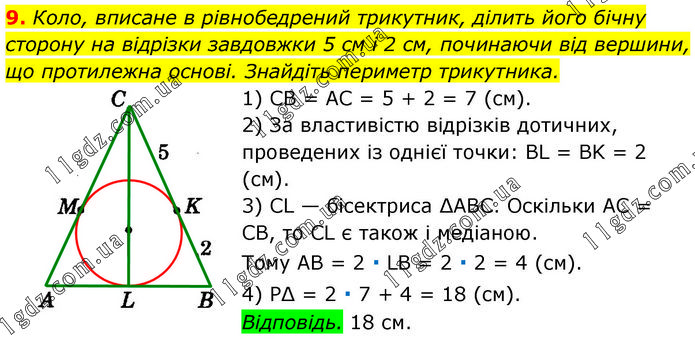Коло, вписане в рівнобедрений трикутник, ділить його бічну сторону на відрізки завдовжки 5 см і 2 см, починаючи від вершини, що протилежна основі. Знайдіть периметр трикутника. 1) CB = AC = 5 + 2 = 7 (см). 2) За властивістю відрізків дотичних, проведених із однієї точки: BL = BK = 2 (см). 3) CL — бісектриса ∆ABC. Оскільки AC = CB, то CL є також і медіаною. Тому AB = 2 ∙ LB = 2 ∙ 2 = 4 (см). 4) P∆ = 2 ∙ 7 + 4 = 18 (см). Відповідь. 18 см.