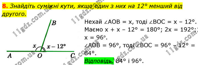 Знайдіть суміжні кути, якщо один з них на 12° менший від другого. Нехай ∠AOB = х, тоді ∠BOC = х – 12°. Маємо х + х – 12° = 180°; 2х = 192°; х = 96°. ∠AOB = 96°, тоді ∠BOC = 96° – 12° = 84°. Відповідь. 84° і 96°.