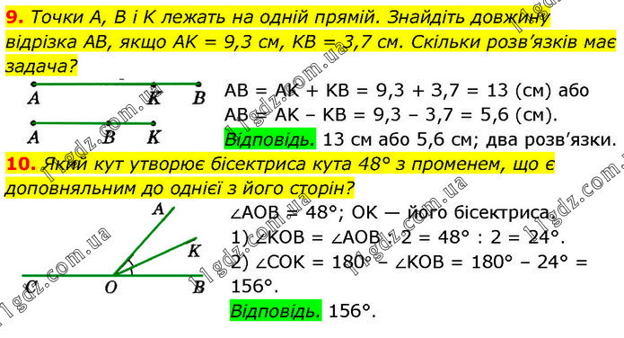 9. Точки А, В і K лежать на одній прямій. Знайдіть довжину відрізка AB, якщо AK = 9,3 см, KB = 3,7 см. Скільки розв’язків має задача? AB = AK + KB = 9,3 + З,7 = 13 (см) або AB = AK – KB = 9,3 – 3,7 = 5,6 (см). Відповідь. 13 см або 5,6 см; два розв’язки. 10. Який кут утворює бісектриса кута 48° з променем, що є доповняльним до однієї з його сторін? ∠AOB = 48°; OK — його бісектриса. 1) ∠KOB = ∠AOB : 2 = 48° : 2 = 24°. 2) ∠COK = 180° – ∠KOB = 180° – 24° = 156°. Відповідь. 156°.
