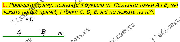 Проведіть пряму, позначте її буквою m. Позначте точки А і В, які лежать на цій прямій, і точки С, D, Е, які не лежать на ній.