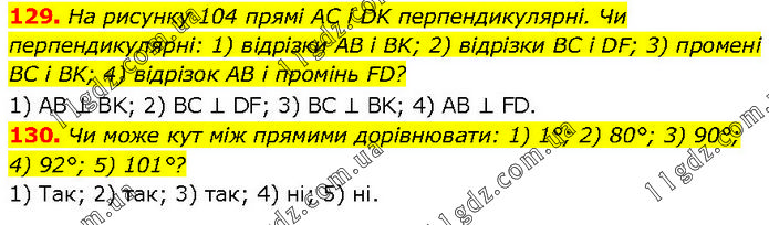 129. На рисунку 104 прямі AC і DK перпендикулярні. Чи перпендикулярні: 1) відрізки AB і BK; 2) відрізки BC і DF; 3) промені BC і BK; 4) відрізок AB і промінь FD? 1) AB ⊥ BK; 2) BC ⊥ DF; 3) BC ⊥ BK; 4) AB ⊥ FD. 130. Чи може кут між прямими дорівнювати: 1) 1°; 2) 80°; 3) 90°; 4) 92°; 5) 101°? 1) Так; 2) так; 3) так; 4) ні; 5) ні.