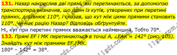 131. Назар накреслив дві прямі, які перетинаються, за допомогою транспортира визначив, що один із кутів, утворених при перетині прямих, дорівнює 110°, і сказав, що кут між цими прямими становить 110°. Чи має рацію Назар? Відповідь обґрунтуйте. Ні, кут при перетині прямих вважається найменший. Тобто 70°. 132. Прямі EF і MK перетинаються в точці А, ∠EAK = 142° (рис. 105). Знайдіть кут між прямими EF і MK. 180° – 142° = 38°.