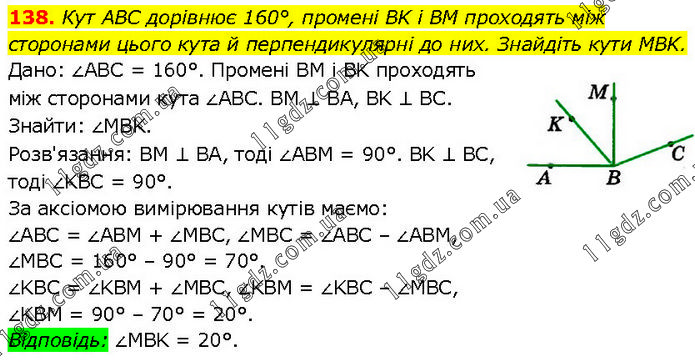Кут ABC дорівнює 160°, промені BK і BM проходять між сторонами цього кута й перпендикулярні до них. Знайдіть кути MBK. Дано: ∠ABC = 160°. Промені BM і BK проходять між сторонами кута ∠ABC. BM ⊥ BA, BK ⊥ BC. Знайти: ∠MBK. Розв'язання: BM ⊥ BA, тоді ∠ABM = 90°. BK ⊥ BC, тоді ∠KBC = 90°. За аксіомою вимірювання кутів маємо: ∠ABC = ∠ABM + ∠MBC, ∠MBC = ∠ABC – ∠ABM, ∠MBC = 160° – 90° = 70°. ∠KBC = ∠KBM + ∠MBC, ∠KBM = ∠KBC – ∠MBC, ∠KBM = 90° – 70° = 20°. Відповідь: ∠MBK = 20°.
