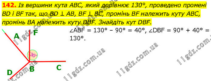 Із вершини кута ABC, який дорівнює 130°, проведено промені BD і BF так, що BD ⊥ AB, BF ⊥ BC, промінь BF належить куту ABC, промінь BA належить куту DBF. Знайдіть кут DBF. ∠ABF = 130° – 90° = 40°, ∠DBF = 90° + 40° = 130°.