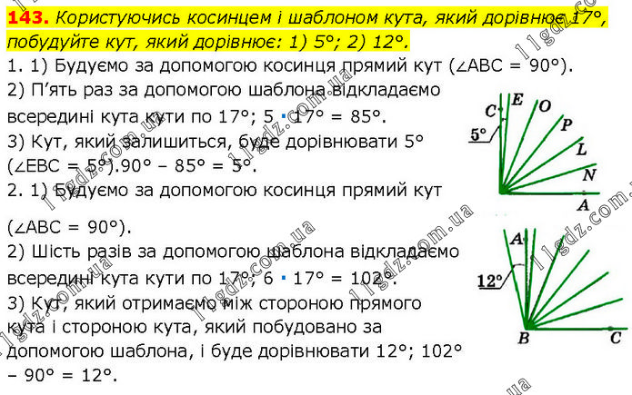 Користуючись косинцем і шаблоном кута, який дорівнює 17°, побудуйте кут, який дорівнює: 1) 5°; 2) 12°. 1. 1) Будуємо за допомогою косинця прямий кут (∠ABC = 90°). 2) П’ять раз за допомогою шаблона відкладаємо всередині кута кути по 17°; 5 ∙ 17° = 85°. 3) Кут, який залишиться, буде дорівнювати 5° (∠EBC = 5°).90° – 85° = 5°. 2. 1) Будуємо за допомогою косинця прямий кут (∠ABC = 90°). 2) Шість разів за допомогою шаблона відкладаємо всередині кута кути по 17°; 6 ∙ 17° = 102°. 3) Кут, який отримаємо між стороною прямого кута і стороною кута, який побудовано за допомогою шаблона, і буде дорівнювати 12°; 102° – 90° = 12°.