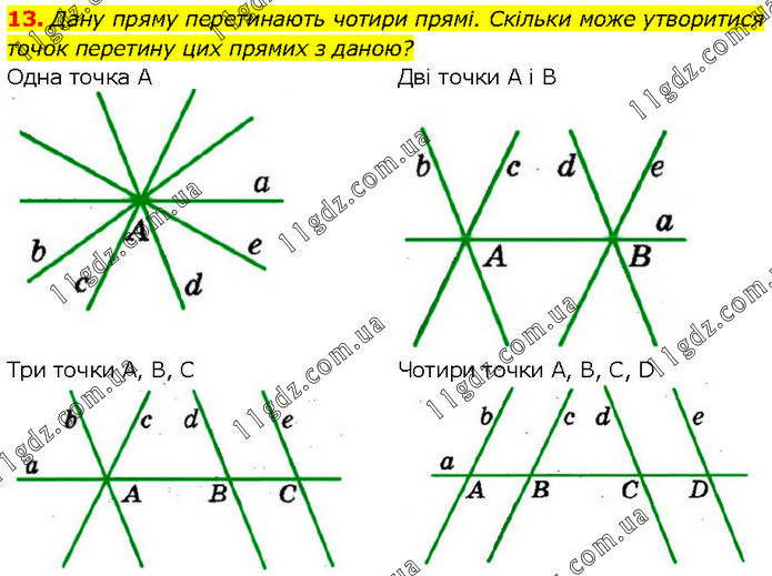 Дану пряму перетинають чотири прямі. Скільки може утворитися точок перетину цих прямих з даною? Одна точка А Дві точки А і В Три точки А, В, С Чотири точки А, В, С, D