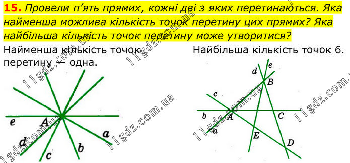 Провели п’ять прямих, кожні дві з яких перетинаються. Яка найменша можлива кількість точок перетину цих прямих? Яка найбільша кількість точок перетину може утворитися? Найменша кількість точок перетину — одна. Найбільша кількість точок 6.