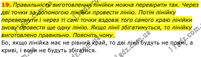 Правильність виготовлення лінійки можна перевірити так. Через дві точки за допомогою лінійки провести лінію. Потім лінійку перевернути і через ті самі точки вздовж того самого краю лінійки знову провести ще одну лінію. Якщо лінії збігатимуться, то лінійку виготовлено правильно. Поясніть чому. Бо, якщо лінійка має не рівний край, то дві лінії будуть не прямі, а криві, і вони не будуть збігатися.