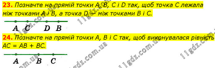 23. Позначте на прямій точки A, B, C і D так, щоб точка C лежала між точками А і В, а точка D — між точками В і С. 24. Позначте на прямій точки A, В і C так, щоб виконувалася рівність AC = AB + BC.