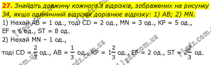 Знайдіть довжину кожного з відрізків, зображених на рисунку 34, якщо одиничний відрізок дорівнює відрізку: 1) AB; 2) MN. 1) Нехай AB = 1 од., тоді CD = 2 од., MN = 3 од., KP = 5 од., EF = 6 од., ST = 8 од. 2) Нехай MN – 1 од., тоді CD = 2/3 од., AB = 1/3 од., KР = 12/3 од., EF = 2 од., ST = 22/3 од.