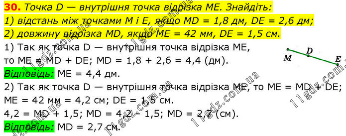 Точка D — внутрішня точка відрізка ME. Знайдіть: 1) відстань між точками M і Е, якщо MD = 1,8 дм, DE = 2,6 дм; 2) довжину відрізка MD, якщо ME = 42 мм, DE = 1,5 см. 1) Так як точка D — внутрішня точка відрізка ME, то ME = MD + DE; MD = 1,8 + 2,6 = 4,4 (дм). Відповідь: МE = 4,4 дм. 2) Так як точка D — внутрішня точка відрізка ME, то ME = MD + DE; ME = 42 мм = 4,2 cм; DE = 1,5 см. 4,2 = MD + 1,5; MD = 4,2 – 1,5; MD = 2,7 (см). Відповідь: MD = 2,7 см.
