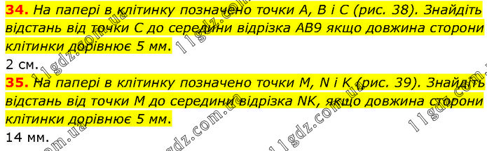 34. На папері в клітинку позначено точки A, В і C (рис. 38). Знайдіть відстань від точки C до середини відрізка AB9 якщо довжина сторони клітинки дорівнює 5 мм. 2 см. 35. На папері в клітинку позначено точки М, N i K (рис. 39). Знайдіть відстань від точки M до середини відрізка NK, якщо довжина сторони клітинки дорівнює 5 мм. 14 мм.
