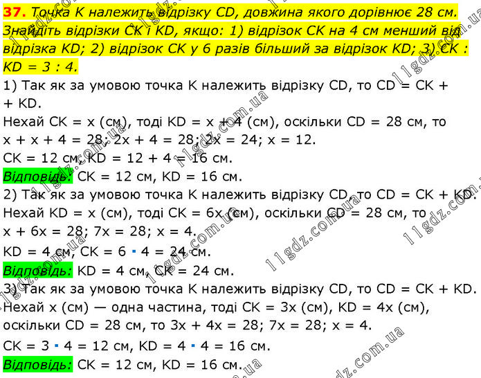 Точка K належить відрізку CD, довжина якого дорівнює 28 см. Знайдіть відрізки CK і KD, якщо: 1) відрізок CK на 4 см менший від відрізка KD; 2) відрізок CK у 6 разів більший за відрізок KD; 3) CK : KD = 3 : 4. 1) Так як за умовою точка K належить відрізку CD, то CD = CK + + KD. Нехай CK = х (см), тоді KD = х + 4 (см), оскільки CD = 28 см, то х + х + 4 = 28; 2х + 4 = 28; 2х = 24; х = 12. CK = 12 см, KD = 12 + 4 = 16 см. Відповідь: CK = 12 см, KD = 16 см. 2) Так як за умовою точка K належить відрізку CD, то CD = CK + KD. Нехай KD = х (см), тоді CK = 6х (см), оскільки CD = 28 см, то х + 6x = 28; 7x = 28; x = 4. KD = 4 см, CK = 6 ∙ 4 = 24 см. Відповідь: KD = 4 см, CK = 24 см. 3) Так як за умовою точка K належить відрізку CD, то CD = CK + KD. Нехай x (см) — одна частина, тоді CK = 3x (см), KD = 4х (см), оскільки CD = 28 см, то 3x + 4х = 28; 7x = 28; х = 4. CK = 3 ∙ 4 = 12 см, KD = 4 ∙ 4 = 16 см. Відповідь: CK = 12 см, KD = 16 см.