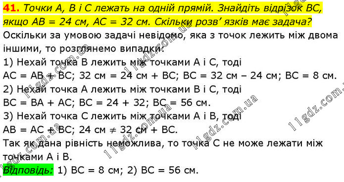 Точки А, В і C лежать на одній прямій. Знайдіть відрізок BC, якщо AB = 24 см, AC = 32 см. Скільки розв’ язків має задача? Оскільки за умовою задачі невідомо, яка з точок лежить між двома іншими, то розглянемо випадки: 1) Нехай точка В лежить між точками А і C, тоді AC = AB + BC; 32 см = 24 см + BC; BC = 32 см – 24 см; BC = 8 см. 2) Нехай точка А лежить між точками B і С, тоді BC = BA + AC; BC = 24 + 32; BC = 56 см. 3) Нехай точка C лежить між точками A i B, тоді AB = AC + BC; 24 см ≠ 32 см + BC. Так як дана рівність неможлива, то точка C не може лежати між точками А і В. Відповідь: 1) BC = 8 см; 2) BC = 56 см.