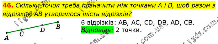 Скільки точок треба позначити між точками А і В, щоб разом з відрізком AB утворилося шість відрізків? 6 відрізків: AB, AC, CD, DB, AD, CB. Відповідь: 2 точки.