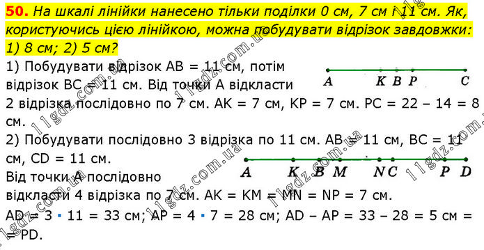 На шкалі лінійки нанесено тільки поділки 0 см, 7 см і 11 см. Як, користуючись цією лінійкою, можна побудувати відрізок завдовжки: 1) 8 см; 2) 5 см? 1) Побудувати відрізок AB = 11 см, потім відрізок BC = 11 см. Від точки А відкласти 2 відрізка послідовно по 7 см. AK = 7 см, KP = 7 см. PC = 22 – 14 = 8 см. 2) Побудувати послідовно 3 відрізка по 11 см. AB = 11 см, BC = 11 см, CD = 11 см. Від точки А послідовно відкласти 4 відрізка по 7 см. AK = KM = MN = NP = 7 см. AD = 3 ∙ 11 = 33 см; AP = 4 ∙ 7 = 28 см; AD – AP = 33 – 28 = 5 см = = PD.