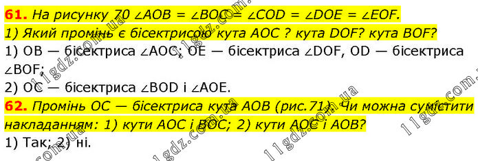 61. На рисунку 70 ∠AOB = ∠BOC = ∠COD = ∠DOE = ∠EOF. 1) Який промінь є бісектрисою кута AOC ? кута DOF? кута BOF? 1) OB — бісектриса ∠AOC; OE — бісектриса ∠DOF, OD — бісектриса ∠BOF; 2) OC — бісектриса ∠BOD і ∠AOE. 62. Промінь OC — бісектриса кута AOB (рис.71). Чи можна сумістити накладанням: 1) кути AOC і ВОС; 2) кути AOC і АОВ? 1) Так; 2) ні.