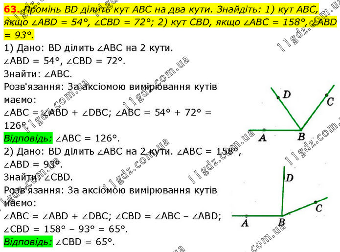 Промінь BD ділить кут ABC на два кути. Знайдіть: 1) кут ABC, якщо ∠ABD = 54°, ∠CBD = 72°; 2) кут CBD, якщо ∠ABC = 158°, ∠ABD = 93°. 1) Дано: BD ділить ∠ABC на 2 кути. ∠ABD = 54°, ∠CBD = 72°. Знайти: ∠ABC. Розв'язання: За аксіомою вимірювання кутів маємо: ∠ABC = ∠ABD + ∠DBC; ∠ABC = 54° + 72° = 126°. Відповідь: ∠ABC = 126°. 2) Дано: BD ділить ∠ABC на 2 кути. ∠ABC = 158°, ∠ABD = 93°. Знайти: ∠CBD. Розв'язання: За аксіомою вимірювання кутів маємо: ∠ABC = ∠ABD + ∠DBC; ∠CBD = ∠ABC – ∠ABD; ∠CBD = 158° – 93° = 65°. Відповідь: ∠CBD = 65°.