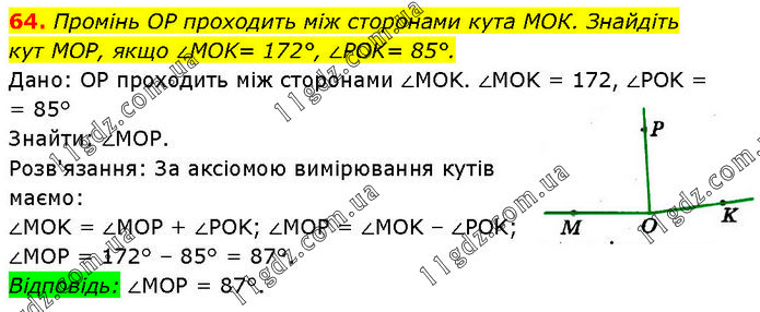 Промінь OP проходить між сторонами кута МОК. Знайдіть кут МОР, якщо ∠MOK= 172°, ∠POK= 85°. Дано: OP проходить між сторонами ∠MOK. ∠MOK = 172, ∠POK = = 85° Знайти: ∠MOP. Розв'язання: За аксіомою вимірювання кутів маємо: ∠MOK = ∠MOP + ∠POK; ∠MOP = ∠MOK – ∠POK; ∠MOP = 172° – 85° = 87°. Відповідь: ∠MOP = 87°.