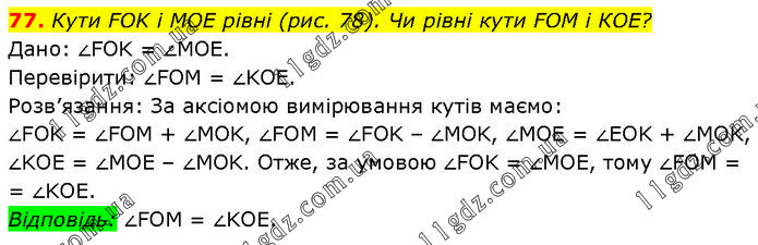 Кути FOK і MOE рівні (рис. 78). Чи рівні кути FOM і КОЕ? Дано: ∠FOK = ∠MOE. Перевірити: ∠FOM = ∠KOE. Розв’язання: За аксіомою вимірювання кутів маємо: ∠FOK = ∠FOM + ∠MOK, ∠FOM = ∠FOK – ∠MOK, ∠MOE = ∠EOK + ∠MOK, ∠KOE = ∠MOE – ∠MOK. Отже, за умовою ∠FOK = ∠MOE, тому ∠FOM = = ∠KOE. Відповідь: ∠FOM = ∠KOE.
