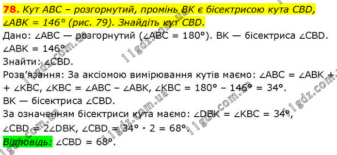 Кут АВС – розгорнутий, промінь BK є бісектрисою кута CBD, ∠ABK = 146° (рис. 79). Знайдіть кут CBD. Дано: ∠ABC — розгорнутий (∠ABC = 180°). BK — бісектриса ∠CBD. ∠ABK = 146°. Знайти: ∠CBD. Розв’язання: За аксіомою вимірювання кутів маємо: ∠ABC = ∠ABK + + ∠KBC, ∠KBC = ∠ABC – ∠ABK, ∠KBC = 180° – 146° = 34°. BK — бісектриса ∠CBD. За означенням бісектриси кута маємо: ∠DBK = ∠KBC = 34°, ∠CBD = 2∠DBK, ∠CBD = 34° ∙ 2 = 68°. Відповідь: ∠CBD = 68°.