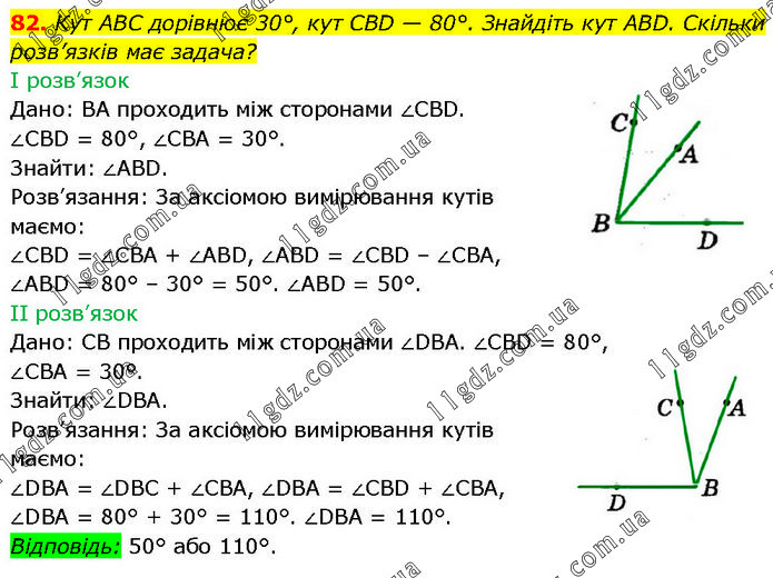 Кут ABC дорівнює 30°, кут CBD — 80°. Знайдіть кут ABD. Скільки розв’язків має задача? І розв’язок Дано: BA проходить між сторонами ∠CBD. ∠CBD = 80°, ∠CBA = 30°. Знайти: ∠ABD. Розв’язання: За аксіомою вимірювання кутів маємо: ∠CBD = ∠CBA + ∠ABD, ∠ABD = ∠CBD – ∠CBA, ∠ABD = 80° – 30° = 50°. ∠ABD = 50°. II розв’язок Дано: CB проходить між сторонами ∠DBA. ∠CBD = 80°, ∠CBA = 30°. Знайти: ∠DBA. Розв’язання: За аксіомою вимірювання кутів маємо: ∠DBA = ∠DBC + ∠CBA, ∠DBA = ∠CBD + ∠CBA, ∠DBA = 80° + 30° = 110°. ∠DBA = 110°. Відповідь: 50° або 110°.