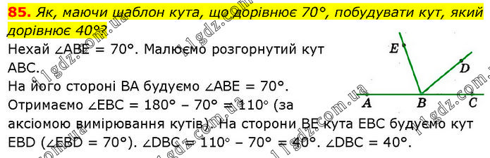 Як, маючи шаблон кута, що дорівнює 70°, побудувати кут, який дорівнює 40°? Нехай ∠ABE = 70°. Малюємо розгорнутий кут ABC. На його стороні BA будуємо ∠ABE = 70°. Отримаємо ∠EBC = 180° – 70° = 110° (за аксіомою вимірювання кутів). На сторони BE кута EBC будуємо кут EBD (∠EBD = 70°). ∠DBC = 110° – 70° = 40°. ∠DBC = 40°.