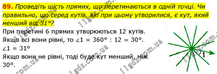 Проведіть шість прямих, що перетинаються в одній точці. Чи правильно, що серед кутів, які при цьому утворилися, є кут, який менший від 31°? При перетині 6 прямих утворюються 12 кутів. Якщо всі вони рівні, то ∠1 = 360° : 12 = 30°. ∠1 = 31° Якщо вони не рівні, тоді буде кут менший, між 30°.