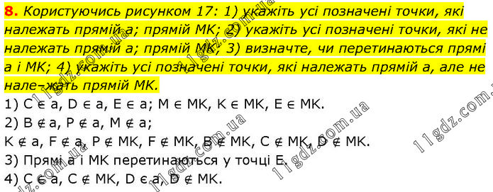 Користуючись рисунком 17: 1) укажіть усі позначені точки, які належать прямій а; прямій MK; 2) укажіть усі позначені точки, які не належать прямій а; прямій MK; 3) визначте, чи перетинаються прямі а і MK; 4) укажіть усі позначені точки, які належать прямій а, але не нале–жать прямій MK. 1) C ∈ a, D ∈ а, E ∈ a; M ∈ MK, K ∈ MK, E ∈ MK. 2) B ∉ а, P ∉ а, M ∉ а; K ∉ а, F ∉ а, P ∉ MK, F ∉ MK, В ∉ МK, C ∉ МK, D ∉ MK. 3) Прямі а і МK перетинаються у точці E. 4) C ∈ а, C ∉ МK, D є а, D ∉ MK.