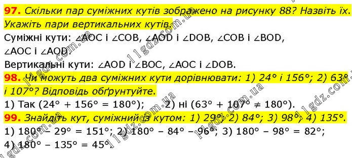97. Скільки пар суміжних кутів зображено на рисунку 88? Назвіть їх. Укажіть пари вертикальних кутів. Суміжні кути: ∠AOC і ∠COB, ∠AOD і ∠DOB, ∠COB і ∠BOD, ∠AOC і ∠AOD. Вертикальні кути: ∠AOD і ∠BOC, ∠AOC і ∠DOB. 98. Чи можуть два суміжних кути дорівнювати: 1) 24° і 156°; 2) 63° і 107°? Відповідь обґрунтуйте. 1) Так (24° + 156° = 180°); 2) ні (63° + 107° ≠ 180°). 99. Знайдіть кут, суміжний із кутом: 1) 29°; 2) 84°; 3) 98°; 4) 135°. 1) 180° – 29° = 151°; 2) 180° – 84° – 96°; 3) 180° – 98° = 82°; 4) 180° – 135° = 45°.