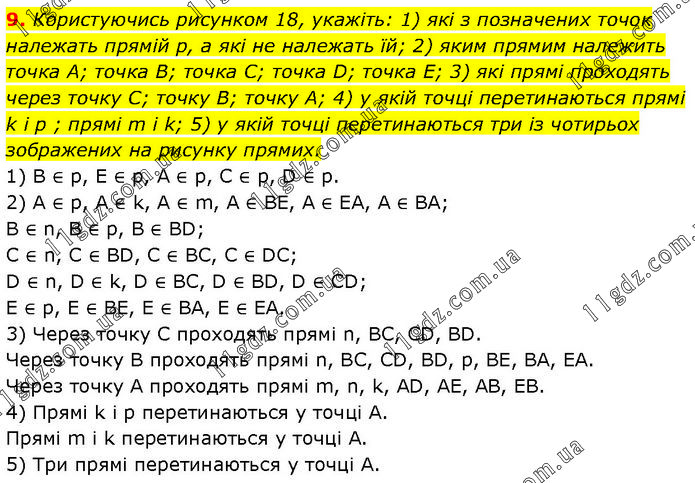 Користуючись рисунком 18, укажіть: 1) які з позначених точок належать прямій р, а які не належать їй; 2) яким прямим належить точка А; точка В; точка С; точка D; точка Е; 3) які прямі проходять через точку С; точку В; точку А; 4) у якій точці перетинаються прямі k і р ; прямі m і k; 5) у якій точці перетинаються три із чотирьох зображених на рисунку прямих. 1) В ∈ р, E ∈ р, А ∈ р, C ∈ р, D ∈ р. 2) А ∈ p, A ∈ k, А ∈ m, А ∈ BE, А ∈ EА, А ∈ BA; В ∈ n, В ∈ р, В ∈ BD; C ∈ n, C ∈ BD, C ∈ BC, C ∈ DC; D ∈ n, D ∈ k, D ∈ BC, D ∈ BD, D ∈ CD; E ∈ р, E ∈ BE, E ∈ BA, E ∈ EА. 3) Через точку C проходять прямі n, BC, CD, BD. Через точку В проходять прямі n, BC, CD, BD, р, BE, BA, EA. Через точку А проходять прямі m, n, k, AD, АE, AB, EВ. 4) Прямі k і р перетинаються у точці А. Прямі m і k перетинаються у точці А. 5) Три прямі перетинаються у точці А.