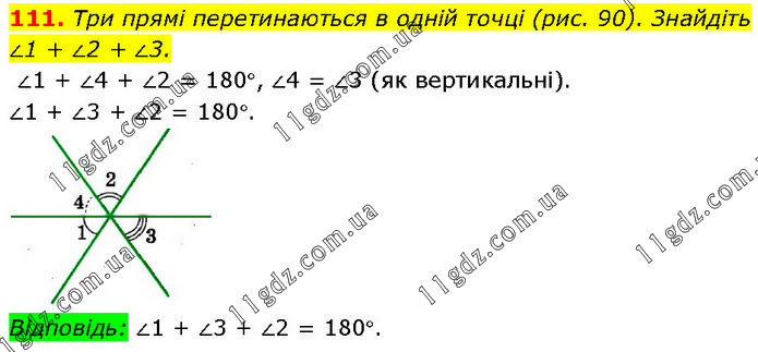 Три прямі перетинаються в одній точці (рис. 90). Знайдіть ∠1 + ∠2 + ∠3. ∠1 + ∠4 + ∠2 = 180°, ∠4 = ∠3 (як вертикальні). ∠1 + ∠3 + ∠2 = 180°. Відповідь: ∠1 + ∠3 + ∠2 = 180°.