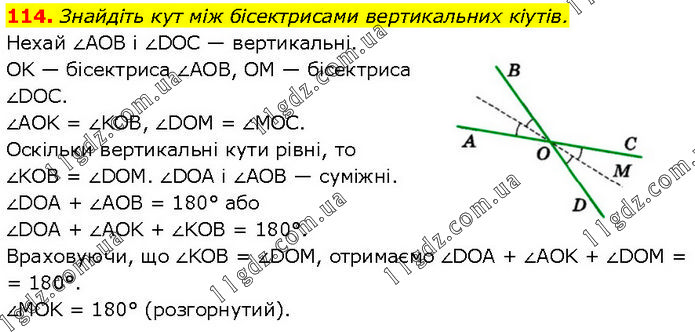 Знайдіть кут між бісектрисами вертикальних кіутів. Нехай ∠AOB і ∠DOC — вертикальні. OK — бісектриса ∠AOB, OM — бісектриса ∠DOC. ∠AOK = ∠KOB, ∠DOM = ∠MOC. Оскільки вертикальні кути рівні, то ∠KOB = ∠DOM. ∠DOA і ∠AOB — суміжні. ∠DOA + ∠AOB = 180° або ∠DOA + ∠AOK + ∠KOB = 180°. Враховуючи, що ∠KOB = ∠DOM, отримаємо ∠DOA + ∠AOK + ∠DOM = = 180°. ∠MOK = 180° (розгорнутий).