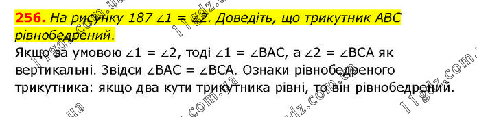 На рисунку 187 ∠1 = ∠2. Доведіть, що трикутник ABC рівнобедрений. Якщо за умовою ∠1 = ∠2, тоді ∠1 = ∠ВАС, а ∠2 = ∠ВСА як вертикальні. Звідси ∠ВАС = ∠ВСА. Ознаки рівнобедреного трикутника: якщо два кути трикутника рівні, то він рівнобедрений.