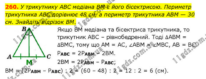 У трикутнику ABC медіана BM є його бісектрисою. Периметр трикутника ABC дорівнює 48 см, а периметр трикутника ABM — 30 см. Знайдіть відрізок BM. Якщо ВМ медіана та бісектриса трикутника, то трикутник АВС – рівнобедрений. Тоді ∆АВМ = ∆ВМС, тому що АМ = АС, ∠АВМ = ∠МВС, АВ = ВС. РАВС = 2РАВМ – 2ВМ. 2ВМ = 2РАВМ – РАВС; ВМ = (2РАВМ – РАВС) : 2 = (60 – 48) : 2 = 12 : 2 = 6 (см).