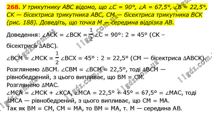 У трикутнику ABC відомо, що ∠C = 90°, ∠A = 67,5°, ∠B = 22,5°, CK — бісектриса трикутника ABC, CM — бісектриса трикутника BCK (рис. 188). Доведіть, що точка M — середина відрізка AB. Доведення: ∠ACK = ∠BCK = 1/2 ∠C = 90°: 2 = 45° (CK – бісектриса ∆ABC). ∠BCM = ∠MCK = 1/2 ∠BCX = 45° : 2 = 22,5° (CM — бісектриса ∆АВСK). Розглянемо ∆BCM. ∠CBM = ∠BCM = 22,5°, тоді ∆BCM — рівнобедрений, з цього випливає, що BM = CM. Розглянемо ∆MAC. ∠MCA = ∠MCK + ∠KCA, ∠MCA = 22,5° + 45° = 67,5° = ∠MAC, тоді ∆MCA — рівнобедрений, з цього випливає, що CM = MA. Так як BM = CM, CM = MA, то BM = MA, т. M — середина АВ.