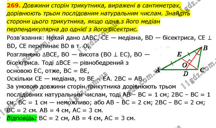 Довжини сторін трикутника, виражені в сантиметрах, дорівнюють трьом послідовним натуральним числам. Знайдіть сторони цього трикутника, якщо одна з його медіан перпендикулярна до однієї з його бісектрис. Розв’язання: Нехай дано ∆АВС, CE — медіана, BD — бісектриса, CE ⊥ BD, CE перетинає BD в т. О. Розглянемо ∆ВСЕ, BO — висота (BO ⊥ EС), BO — бісектриса. Тоді ∆ВСЕ — рівнобедрений з основою EC, отже, BC = BE, Оскільки CE — медіана, то BE = EA. 2ВС = АВ. За умовою довжини сторін трикутника дорівнюють трьом послідовних натуральним числам, тоді AB – BC = 1 см; 2BC – BC = 1 см; BC = 1 см — неможливо; або AB – BC = 2 см; 2ВС – BC = 2 см; BC = 2 см. AB = 4 см, AC = 3 см. Відповідь: BC = 2 см, AB = 4 см, AC = 3 см.