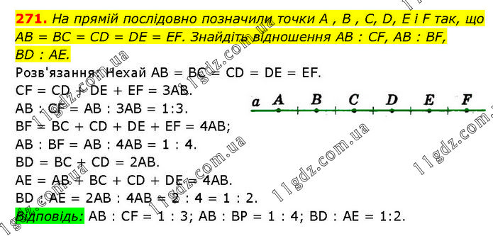 На прямій послідовно позначили точки А , В , С, D, E і F так, що AB = BC = CD = DE = EF. Знайдіть відношення AB : CF, AB : BF, BD : AE. Розв'язання: Нехай AB = BC = CD = DE = EF. CF = CD + DE + EF = ЗAB. AB : CF = AB : ЗАВ = 1:3. BF = BC + CD + DE + EF = 4АВ; AB : BF = AB : 4AB = 1 : 4. BD = BC + CD = 2AB. AE = AB + BC + CD + DE = 4AB. BD : AE = 2АВ : 4AB = 2 : 4 = 1 : 2. Відповідь: AB : CF = 1 : 3; AB : BP = 1 : 4; BD : AE = 1:2.