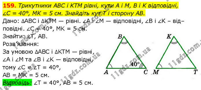 Трикутники ABC і KTM рівні, кути А і М, B i K відповідні, ∠C = 40°, MK = 5 см. Знайдіть кут T і сторону AB. Дано: ∆ABC і ∆KTM — рівні. ∠A і ∠M — відповідні, ∠B і ∠К – від– повідні. ∠C = 40°, MK = 5 см. Знайти: ∠T, AB. Розв’язання: За умовою ∆ABC і ∆KTM — рівні, ∠A і ∠M та ∠B і ∠K — відповідні, тому ∠C = ∠T = 40°, AB = MK = 5 см. Відповідь: ∠T = 40°, AB = 5 см.