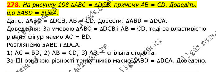 На рисунку 198 ∆ABC = ∆DCB, причому AB = CD. Доведіть, що ∆ABD = ∆DCA. Дано: ∆ABC = ∆DCB, AB = CD. Довести: ∆ABD = ∆DCA. Доведення: За умовою ∆ABC = ∆DCB і AB = CD, тоді за властивістю рівних фігур маємо AC = BD. Розглянемо ∆ABD і ∆DCA. 1) AC = BD; 2) AB = CD; 3) AD — спільна сторона. За III ознакою рівності трикутників маємо ∆ABD = ∆DCA. Доведено.